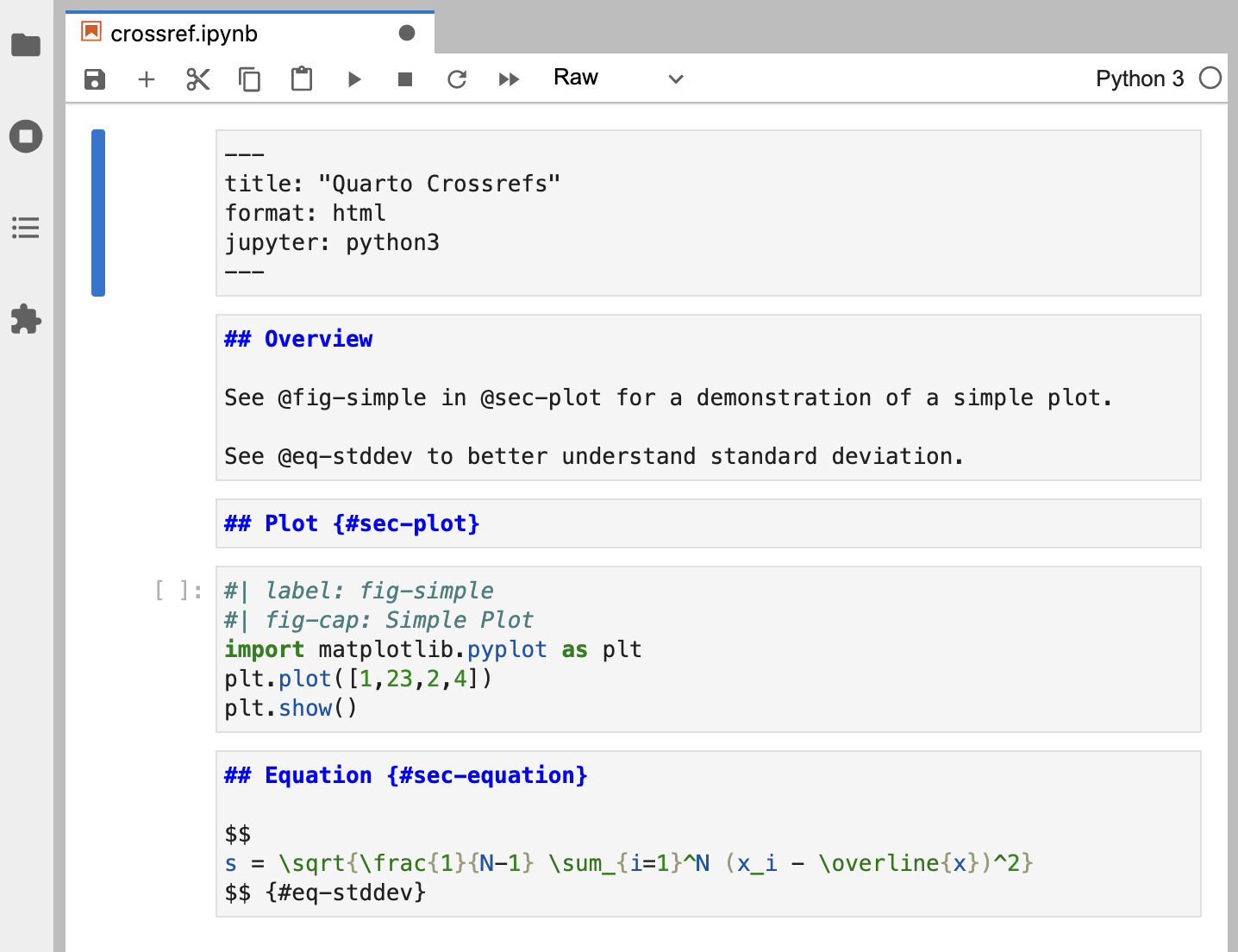 In this tutorial we’ll show you how to author Quarto documents in Jupyter Lab. In particular, we’ll discuss the various document formats you can produce and show you how to add components like table of contents, equations, citations, cross-references, and more.