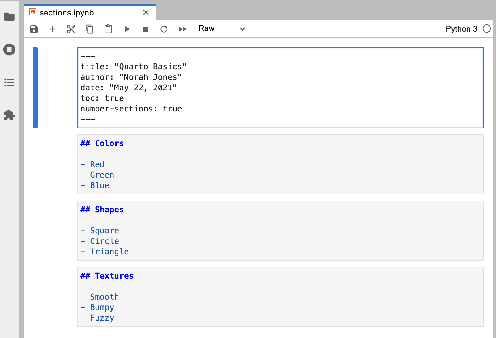 Let’s create a notebook and define various formats for it to be rendered to and add some options to each of the formats. As a reminder, document options are specified in YAML within a “Raw” cell at the beginning of the notebook. To create a Raw cell, add a cell at the top of the notebook and set its type to Raw using the notebook toolbar: