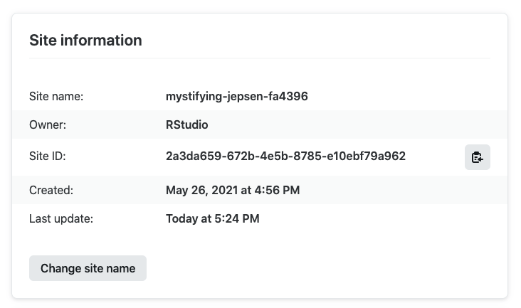 The domain name for your published site will by default use a random identifier (e.g. mystifying-jepsen-fa4396.netlify.app