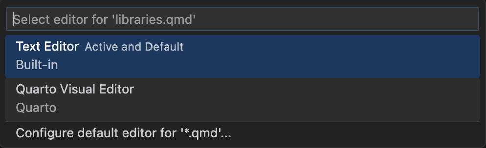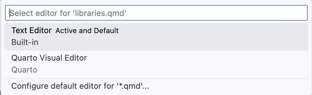 Note that this menu also provides an option to configure the default editor for .qmd