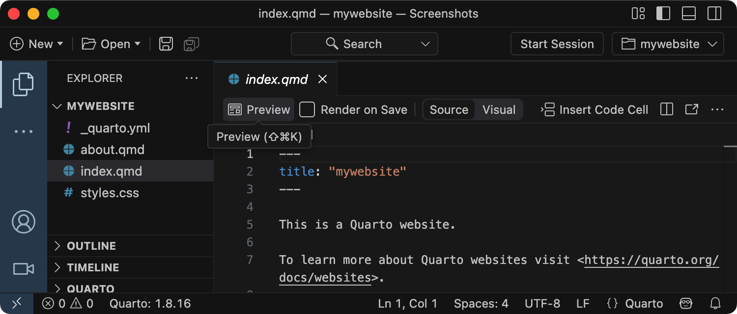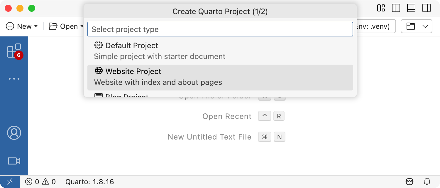 To create a new website project within RStudio, use the New Project command and select Quarto Website: