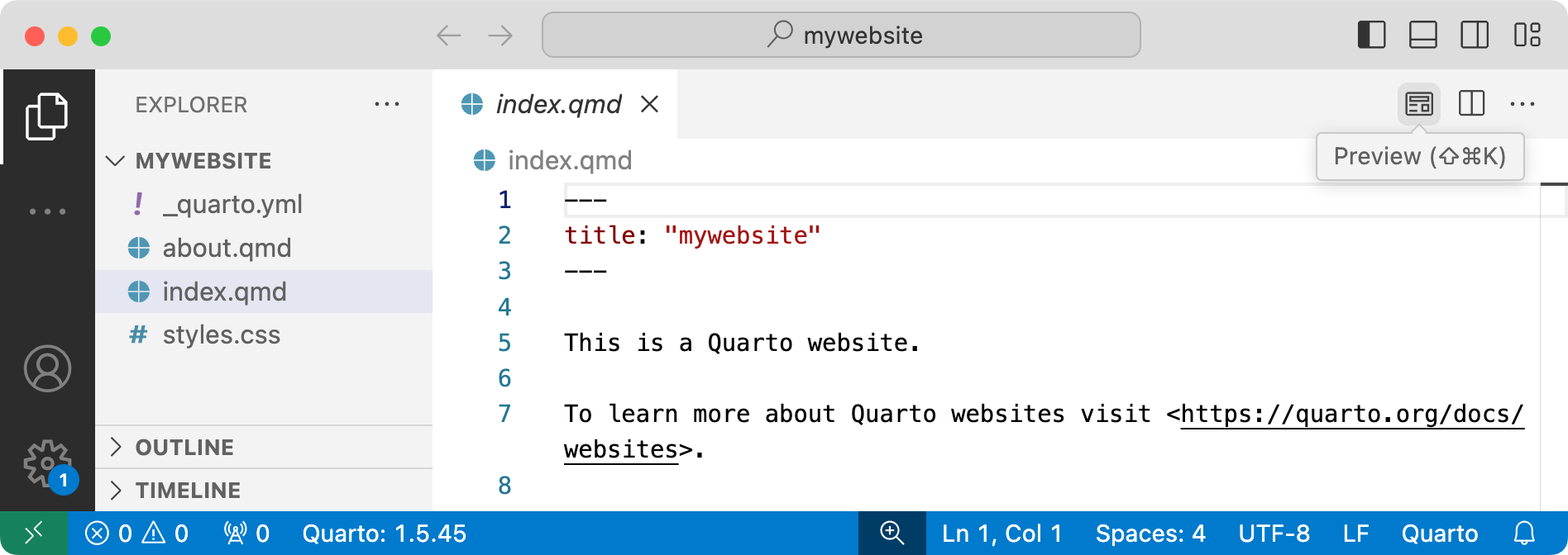 The new website project will be created and opened within VS Code. Click the Preview button ()to preview the website: